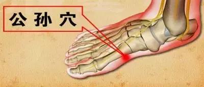 ②揉公孫穴:盤腿端坐,用左手拇指按壓右足公孫穴(足內側,第一跖骨下緣),左旋按壓15次,右旋按壓15次,然后用右手拇指按壓左足公孫穴,手法同前。