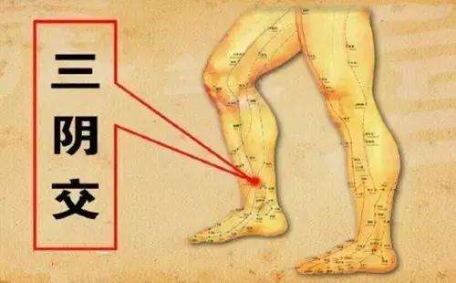 ③揉三陰交穴:盤腿端坐,用左手拇指按壓三陰交穴(內踝尖上3寸,脛骨后緣處),左旋按壓15次,右旋按壓15次,然后用右手按壓左三陰交穴,手法同前。
