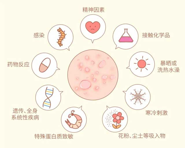 如花粉、動(dòng)物皮屑、粉塵、塵螨、真菌的孢子及一些揮發(fā)性化學(xué)品等,皮膚接觸物有某些植物、動(dòng)物毛發(fā)、昆蟲(chóng)叮螫、毒毛蟲(chóng)刺激等。