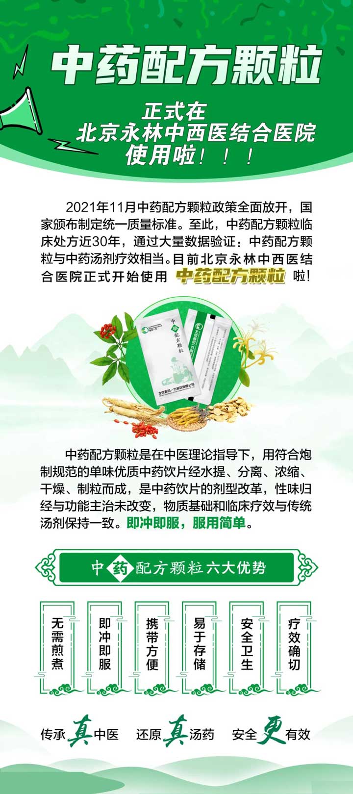 為進一步弘揚中醫藥文化,促進中醫藥傳統診療手段與現代科技相結合,滿足患者就醫用藥需求,同時方便患者服用中藥制劑,提高中藥制劑多元化發展應用,北京永林中西醫結合醫院藥劑科引進中藥配方顆粒劑,為患者提供更高效、安全、方便、快捷的中醫藥服務。