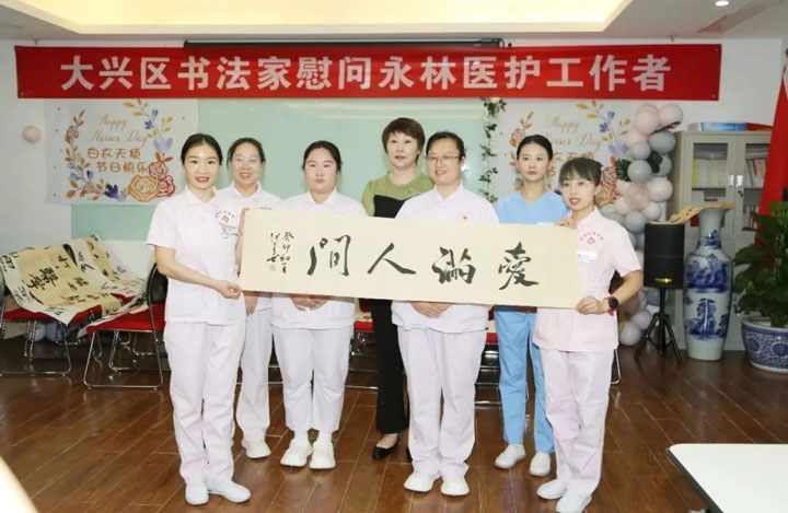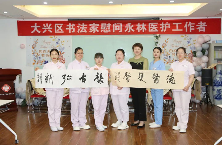 趙永林院長對大興區書法家們的到來表示熱烈的歡迎和衷心的的感謝,書法家們為永林醫護工作者慰問創作,是對永林醫院廣大醫護工作者工作的一種肯定,同時也是一種鼓勵。本次慰問開拓了永林醫院職工的藝術視野,有利于審美情趣的進一步提升。北京永林中西醫結合醫院將繼續發揚救死扶傷、無私奉獻的企業精神,以患者為中心,以醫療質量為核心,不斷提高醫療技術水平和服務質量,為廣大市民提供更加優質、高效、便捷的醫療健康服務,為我區衛生健康事業發展貢獻力量。
