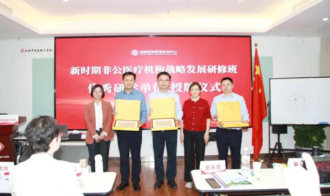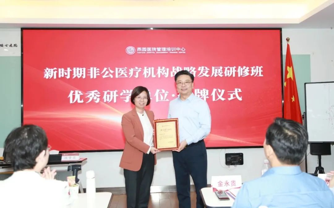 會上,為表彰北京永林中西醫結合醫院及相關醫療機構對研修班工作的大力支持和所做出的貢獻,北京大學醫院管理項目部、燕園醫院管理培訓中心陳素英主任為我院頒發“優秀研學單位”牌匾,并贈送紀念品。