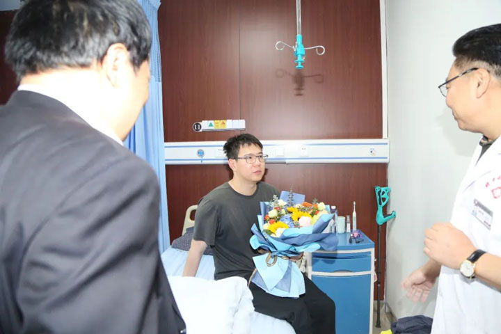11月14日上午,我院趙永林院長與李世榮副院長到住院部看望在我院康復治療的殘奧會射箭冠軍何梓豪先生,對其到我院康復表示關心和慰問,并對其勇奪兩枚殘奧會射箭金牌的奮勇拼搏精神給予高度稱贊。