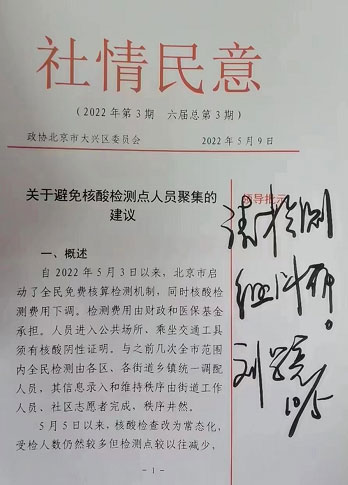 除此之外,作為區(qū)政協(xié)委員,還持續(xù)關(guān)注于疫情防控中出現(xiàn)的問題通過大興區(qū)政協(xié)提交社情民意,其“關(guān)于疫情防控方面避免核酸檢測點(diǎn)人員聚集的建議”得到了大興區(qū)區(qū)長劉學(xué)亮的批示。
