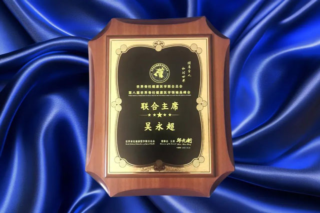 鑒于吳永超主任在脊柱側彎保守治療領域的重大貢獻,世界脊柱健康醫學聯合總會主席邱九桁教授特授予吳永超主任“世界脊柱健康醫學聯合總會第八屆世界脊柱健康醫學領袖高峰會聯合主席”殊榮。