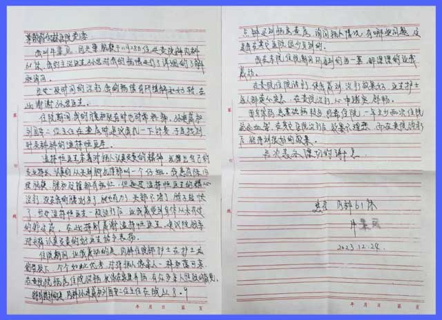 12月24日,一位在我院內科住院治療的患者牛女士激動的將一封感謝信交到我院內科病區孫建威主任手中,對內科住院醫護的精心治療和暖心服務表示衷心感謝。