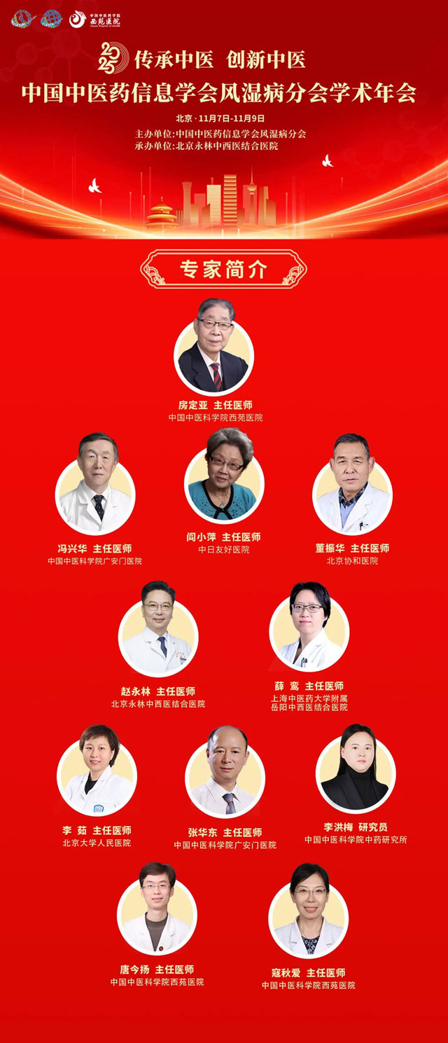 本次年會(huì)邀請(qǐng)以“房定亞教授、馮興華教授、閻小萍教授、董振華教授”為代表的中醫(yī)風(fēng)濕名家分享中醫(yī)治療風(fēng)濕免疫疾病的學(xué)術(shù)思想與臨證經(jīng)驗(yàn);邀請(qǐng)西醫(yī)風(fēng)濕病領(lǐng)域的權(quán)威專(zhuān)家講授關(guān)于風(fēng)濕免疫疾病的最新成果與前沿動(dòng)態(tài);邀請(qǐng)中醫(yī)藥藥學(xué)專(zhuān)家分享風(fēng)濕病新藥的研究與開(kāi)發(fā)。名家薈萃、中西融合,共話(huà)風(fēng)濕。